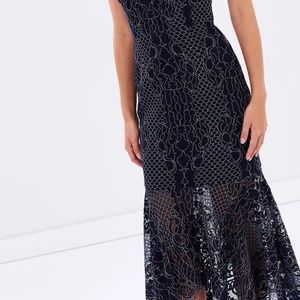 Elegant navy lace midi dress. Strapless design. Scalloped hemline. Perfect for special occasions.