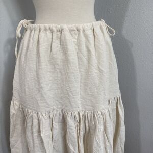 The Shona Joy Skirt in size 4 is a minimalist and elegant ivory linen Aria drawstring skirt. It features a mid-rise waist and a midi length with a split, making it perfect for various occasions such as travel, weddings, parties, workwear, and more. The lightweight and elastic waist skirt is ideal for all seasons, particularly summer, fall, and spring. With a solid color and bohemian theme, this skirt is a versatile and stylish addition to any woman's wardrobe. Made by the brand Shona Joy, this skirt is machine washable and easy to care for.