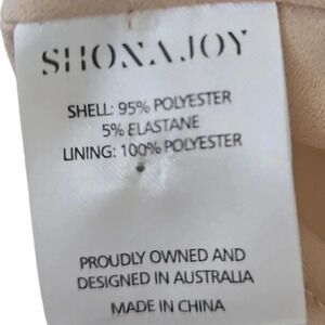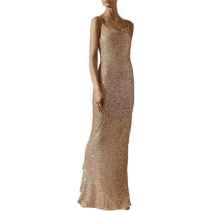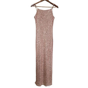 Shona Joy Soiree Bias Cowl Maxi Dress in Rose Gold. Size 6. Features cowl neckline, sleeveless, adjustable spaghetti straps, luxurious sequin fabric, maxi length, and fully lined. Style SJ3926. Shell: 95% Polyester, 5% Elastane. Lining: 100% Polyester. Excellent pre-owned condition, no flaws.