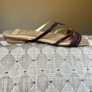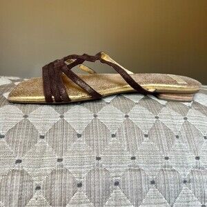 New With Tags SHOOLA Layla Brown Leather Slide Sandals w/ Metallic Gold Footbed Size EU 39 fits like US 8. Please consider bundling for the best deal. Thank you for shopping.
