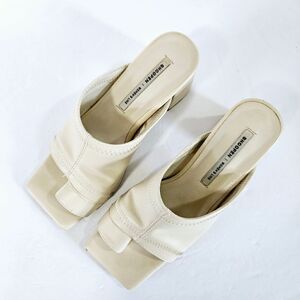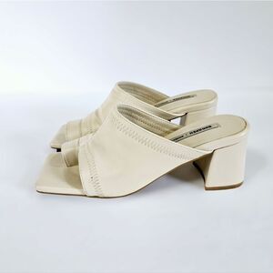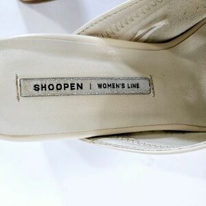 This is a cute pair of square toe mules from Shoopen. Made with a soft nude colored vegan leather. Chunky block heel and a split toe for extra security. These are in good pre-owned condition with some wear on the soles and minor scuffs. Shoopen is a Korean brand. These are a Korean size 230 which is equivalent to a US 6.