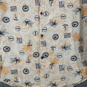 Condition: Nice Button-Up Shirt with Lovely Travel Stamps Print. No stains or rips!