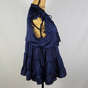 Shop Neighbor women’s blouse in size Large, featuring a luxe navy blue satin-look fabric with tiered ruffles, flutter sleeves, and a tasseled tie neckline. Fully lined for comfort. Stylish and versatile—great for festivals, nights out, or chic everyday wear.