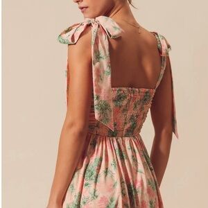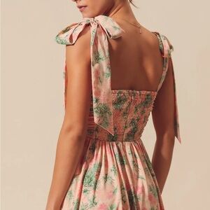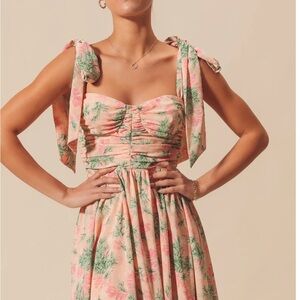 Elegant maxi dress with floral pattern. Features ruched bodice and tie straps. Perfect for any occasion.