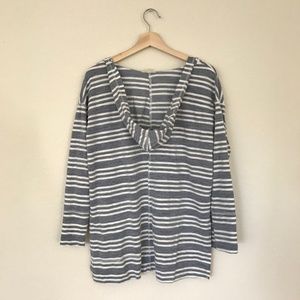 The best spring/summer hoodie from shopstevie.com Stevie Hender's line. Lightweight, perfect for the beach! In a versatile blue/white fabric. Contrast stitching detail, side slits and a v-neck with hood. Size small. In excellent gently used condition.