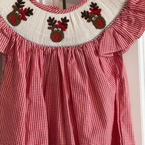Charming red gingham jumper featuring adorable reindeer embroidery. Perfect for festive occasions.