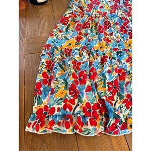 This floral dress features bold colors and is such a bright and happy piece! It has flutter sleeves and ruffle details we can’t get enough of. Dress fits true to size.