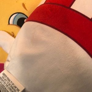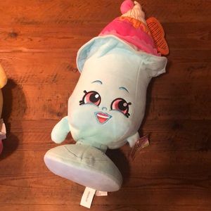 Large plush shopkins. Tags still attached on one. We’ve had them in storage in sealed bins. In great condition. Small stain on one pictured . Not really noticeable. I never tried to clean as I just noticed it.