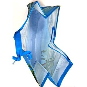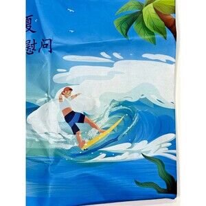 Reusable Shopper Bag with an all-over print of a surfer, tropical palm trees, and distant birds on blue background. Features dual web handles with 2 snap closure. Lightweight, foldable, and packable for grocery shopping, travel, and car totes. Add colorful beach vibes to your errands with this tropical tote.
