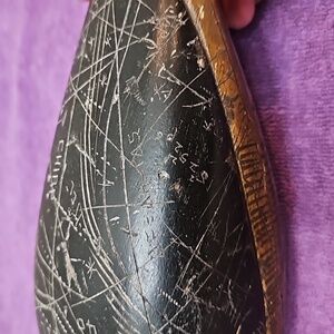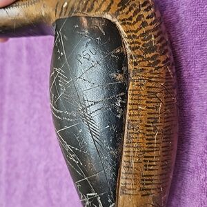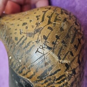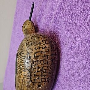 Chirp,Kat,Spra,schnauzer power, spot loves puff ,amu amas amat,Eeyore,Tra la la, bruhilda, and sigfried. All kinds of math symbols and patterns all over. I can only imagine how much fun this was to make at the time. I make no promises nor do I know what PSU it is from who made it nor where it was made. This is a cool piece of folk art. Or use it as a decor accent or add it to your collection of decoys.