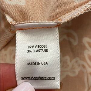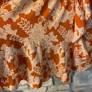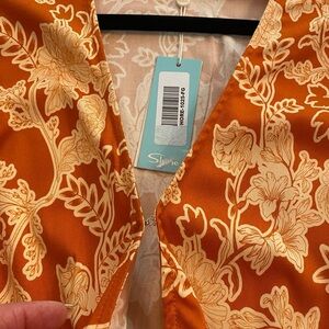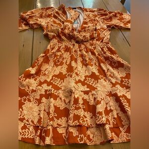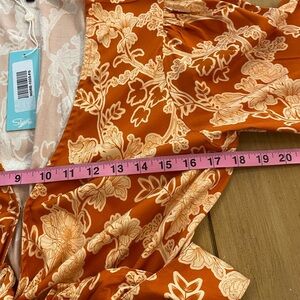 Stylish orange and gold floral new dress by Shore. It has an attractive V-neck than a tie knot with an additional small peep hole underneath between the tie and the tummy. it is such a beautiful print and a very versatile dress that can be worn with sandals or dressed up. Great for travel and resort wear. I have the measurements in the pictures. It has a stretchy waist and a flowing bottom. Very comfortable. Please let me know if you have any questions and thank you for considering my item. 🌷