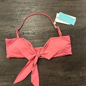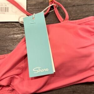 New with tags (NWT) Shore brand two piece swim bikini set. Women’s size XL on both pieces. Solid bubble gum pink is fun and flirty with high rise bottoms and bikini top with functioning tie in front for added detail. Top is bandeau with a halter strap that can be removed. Gold hardware and pads in top can be removed if desired. This pink is easy to mix and match with other swim if desired, such as classic tone.