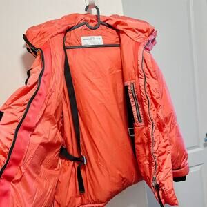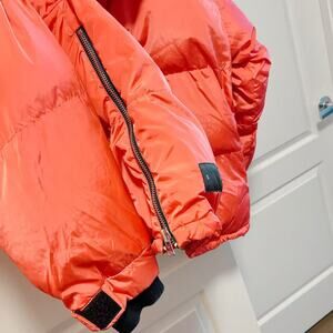 Shoreditch Ski Club jacket in vibrant orange, crafted from 100% recycled polyamide for a sustainable yet durable finish. Features long sleeves, a front zipper closure, and a flattering silhouette that measures approximately 29.5" from shoulder to hem. In excellent pre-owned condition with no visible flaws. A versatile outerwear piece perfect for transitional weather, casual wear, or layering in colder months.