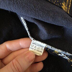 * Color: Navy Blue with Yellow & White “Bahamas” Tropical Print (palm trees, sailboats, islands)