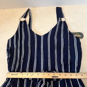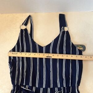 Shoreline. Jumpsuit. Blue/White Stripe. Size L. Side Pockets. Silver Circle attachment to straps. Description and measurements shown in photo.