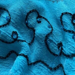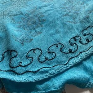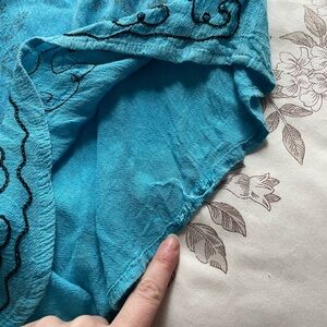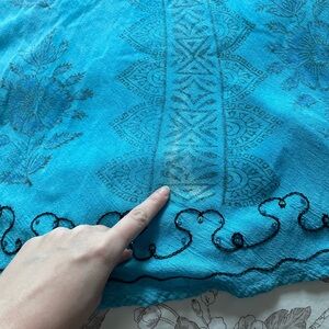 Really pretty dress that features floral and boho prints as well as embroidery and sequins along neckline and bottom hem. Also has a rounded/uneven hemline.