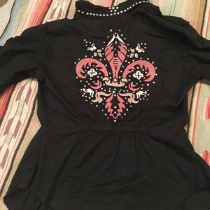 Studded, embroidered and stones shirt. Flyer De' Leis on back embroidered. Super cute