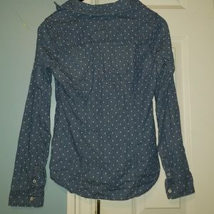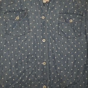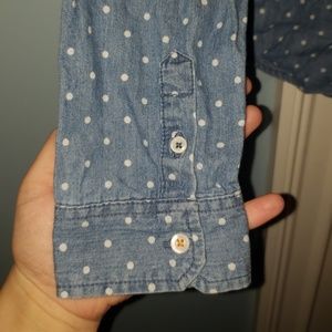 Denim button up shirt. Polka dots! Two pockets at the top with buttons and has buttons on the sleeve as well.