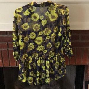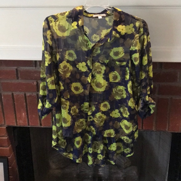 Sheer button up shirt. Asymmetrical. Pleats in back. Long or short sleeves with buttons to make 3/4 sleeves. Pocket. Colo: Navy, Chartreuse, Copper.