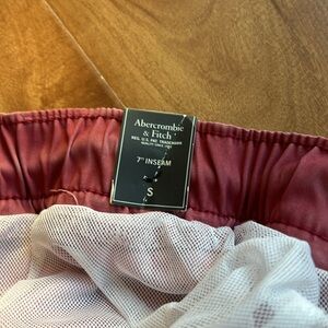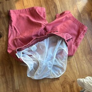 Red fatigue color with a white mesh liner, picture taken. Two front pockets have a zipper and back two pockets have a hidden button which is good to keep things secure. Photo taken of measurements. Kept in a smoke free and pet free environment. 100% polyester