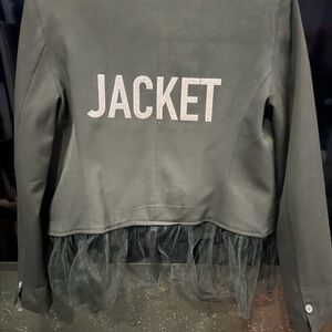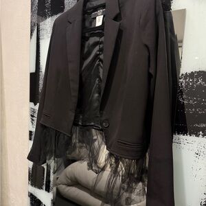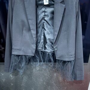 Elevate your wardrobe with this one of a kind black blazer, featuring chiffon accent trim . This is a fun piece for the fashion forward girl .