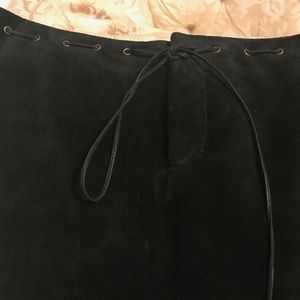 The label has been cut from this designer soft leather fringed skirt. Bottom is slated with 4 inch fringed hem. 100% Leather. Fully lined. Professionally Leather clean only. Size 26 Waist. Worn twice. Rock this skirt with the red and black lace tank !