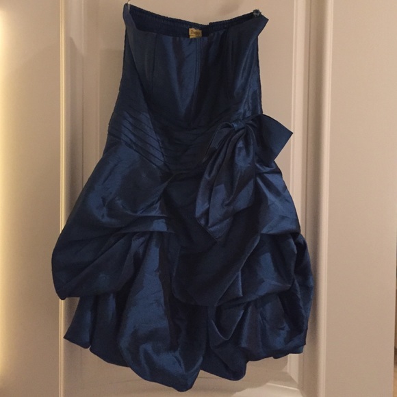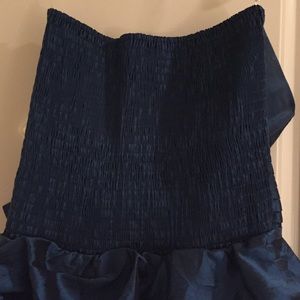 Short dark blue dress with light, big ruffles and a bow on the side. Strapless. Has an elastic/stretchy band on back for easy slip-on. Worn once, but like new.