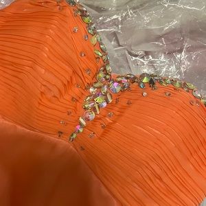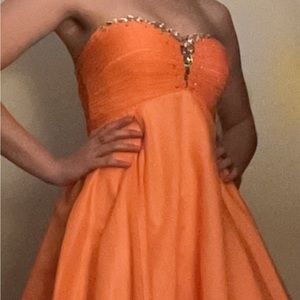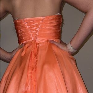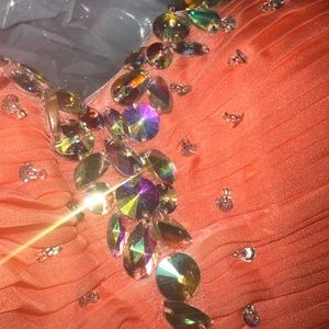 Gorgeous homecoming dress! Satin skirt with a fitted bodice. Lace up back and bejeweled front. Strapless. Extra beading included. Worn once very flattering. No tears or post beading. Excellent condition!!