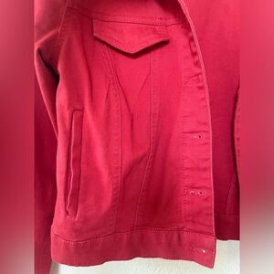 BCBG Generation Cropped Denim Trucker Jean Jacket, red, embroidered, size XXS