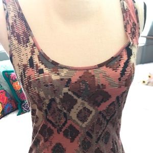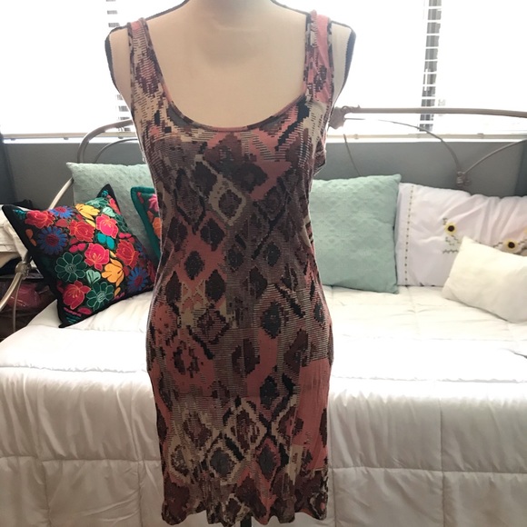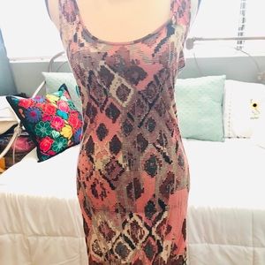 Cute dress with pink design. Has open back. Super cute for the summer. Size medium but material is super fresh and stretchy.