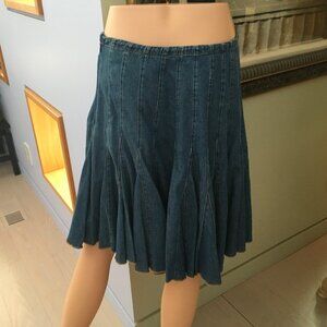This fun short gored all cotton denim skirt by For Joesph has a side zipper. The skirt sits low on the hips. It is a size S with these approximate measurements:
