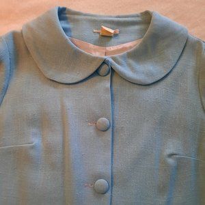 Size 16. Robin's egg blue jacket with shawl collar and 3 covered buttons. Inside back and sleeve ruffles are lined. 3/4 length Tulip sleeves add to the designer features of this spring jacket. Excellent condition.