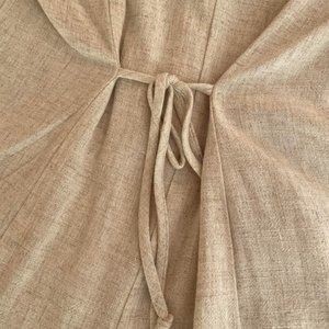 Tan short linen jumpsuit. Short sleeve with 4 gold ball buttons in the front. low v-neck. strings to tie in the back to give you shape