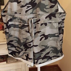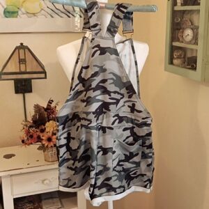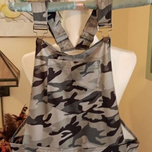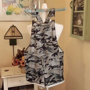 Super cute knit overalls. Drawstring waist, Adjustable straps. Size M measures 36 at waist, adjust here, 40 at hips, front pockets here . Roll up cuffs. 13 inch rise. The color is light army green.