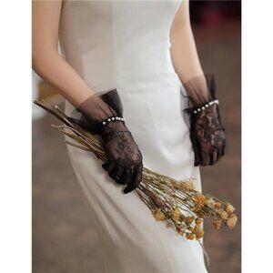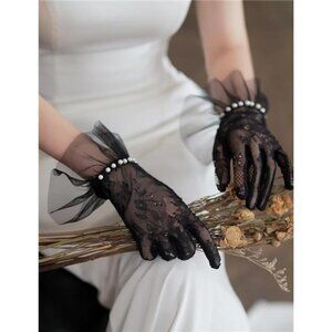 Short Lace Mesh Gloves Tulle Border with Pearls Wedding Opera Tea Party Gloves
