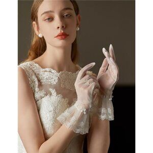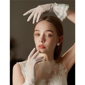 Short Lace Mesh Gloves Tulle Border with Pearls Wedding Opera Tea Party Gloves