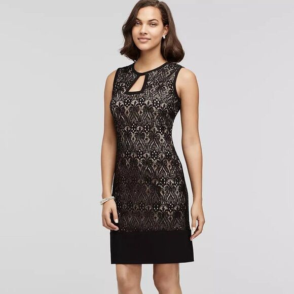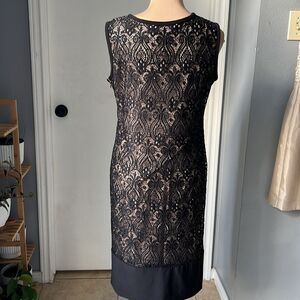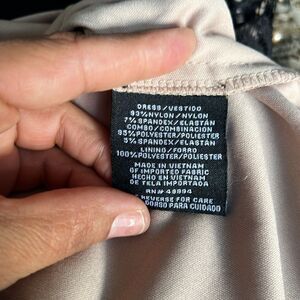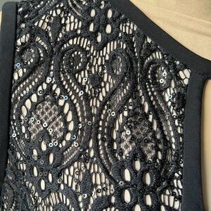 Gently Used A dress fit for the occasion! This mother of the bride or groom dress is the perfect pick! All over black lace with nude lining creates a timeless elegant look, while Key Hole detail adds to the glam factor of this dress.
