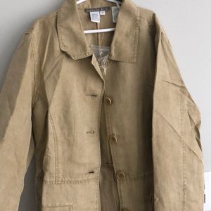 Short linen/silk blend jacket, never worn. Color is more tan, pigment dyed fabric.