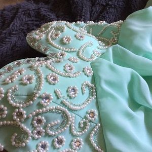 This beautiful dress has pearl, rhinestone and small beaded designs on the chest. It is a light mint color. The back zips and then ties. There is a built in bra. ❗️ willing to negotiate price❗️