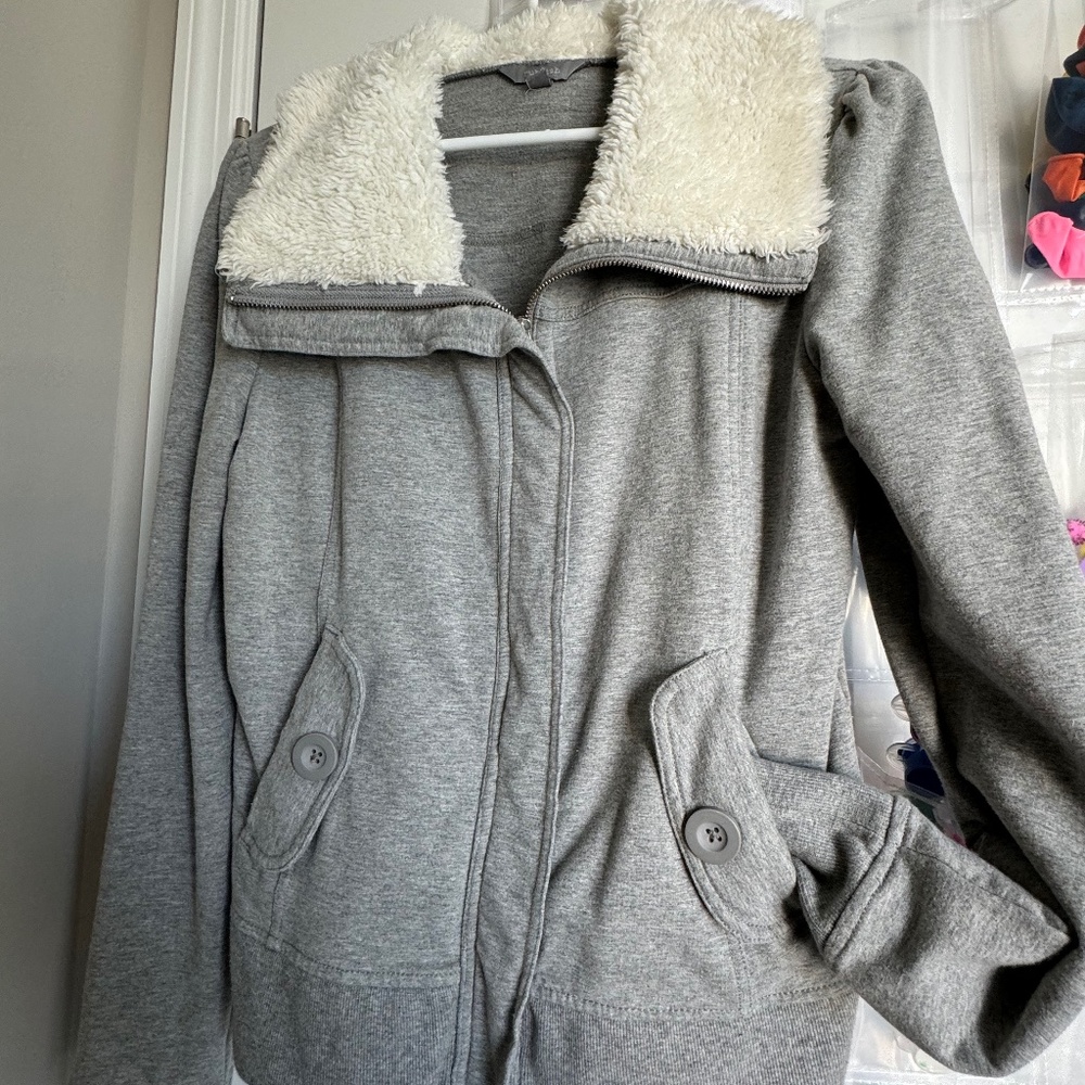 Short Gray Jacket with trim and full zip. Button detail on pockets. Trim is very soft!