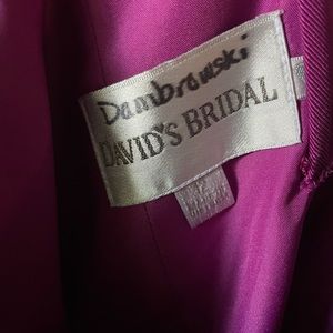 Original garment had no straps but straps were installed as a modification from David’s Bridal directly. Gently used condition. The dress is 100% Polyester and is hand wash or dry clean only.
