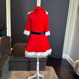 Women’s Short Red Velvet Hooded Dress White Faux Fur Trim Mrs Claus Christmas Costume