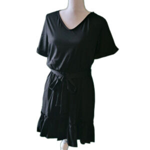 Short Roll Sleeve Flowy Swing Ruffle Dress Tie Waist with Pockets Sz M
