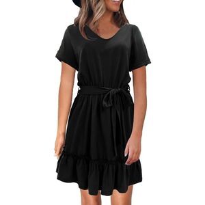 Check out this Short Roll Sleeve Flowy Swing Ruffle Dress Tie Waist with Pockets today!