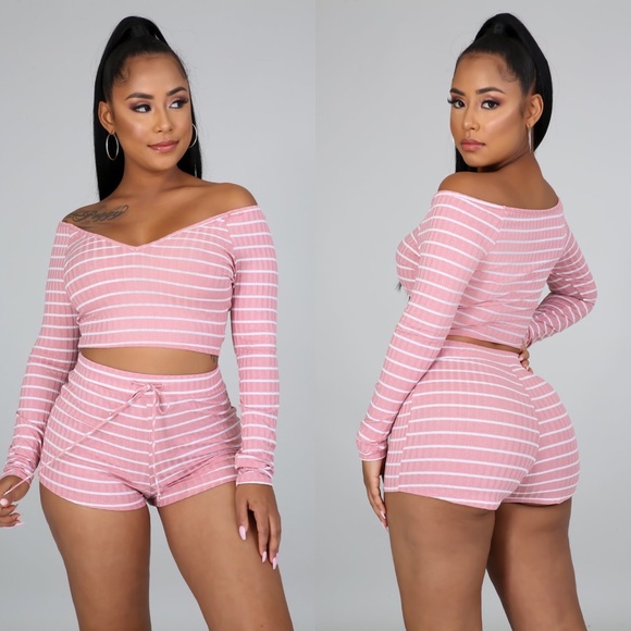 This flirty short set is perfect for relaxing around the house or running errands. This set comes with an off shoulder top and drawstring shorts to aid with extra comfort.