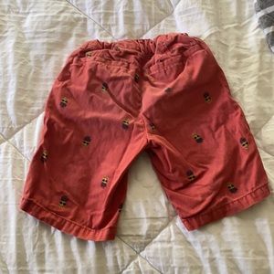 Redish colored shorts: 4 pockets, button, zipper, adjustable waistband. Shorts have pineapples wearing sunglasses printed all over.