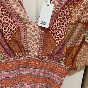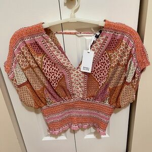 Short sleeve blouse touched on the bottom, with large V cuts front and back. Size - Medium, Color - Multicolor, Material - Rayon