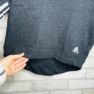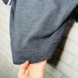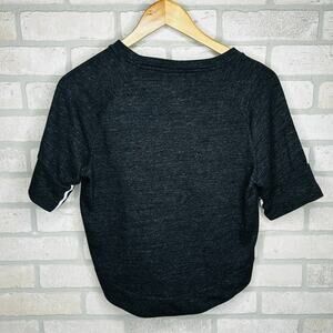 Very dark gray/black crewneck sweatshirt material tshirt. Shorter in the front. The back does have some piling on the right side (see pics).