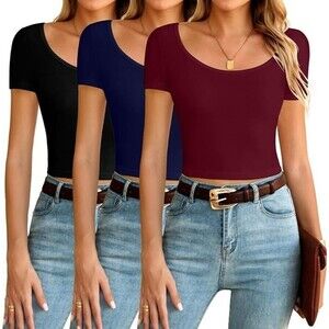 Short Sleeve Crop Tops for Women Slim Fit U Neck Half Shirts, 3 Pcs.