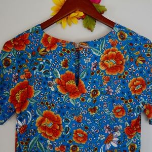 This Rose + Olive short sleeve features vibrant colors and a beautiful floral design. Lightweight material and metal clasp closure in the back. 1 inch notches on both sides of the bottom of the shirt.